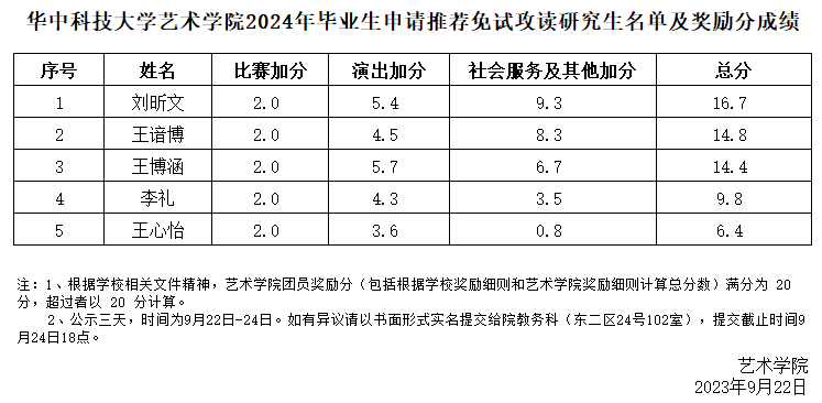 根据学校本科生院《关于做好我校2024年推荐优秀应届本科毕业生免试攻读研究生工作的通知》、《世界杯官方网页版2024年推荐优秀应届本科毕业生免试攻读研究生工作实施办法》的精神,现对2024年推免申请人的奖励分成绩进行公示(见下表)。