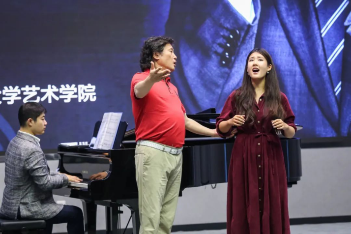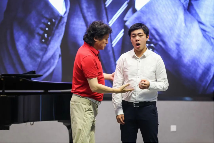 戴老师的学生孙田飞雪,一位抒情男高音带来了一首著名歌剧选段《绿树成荫》,戴老师在现场对他进行了技术上的指导。